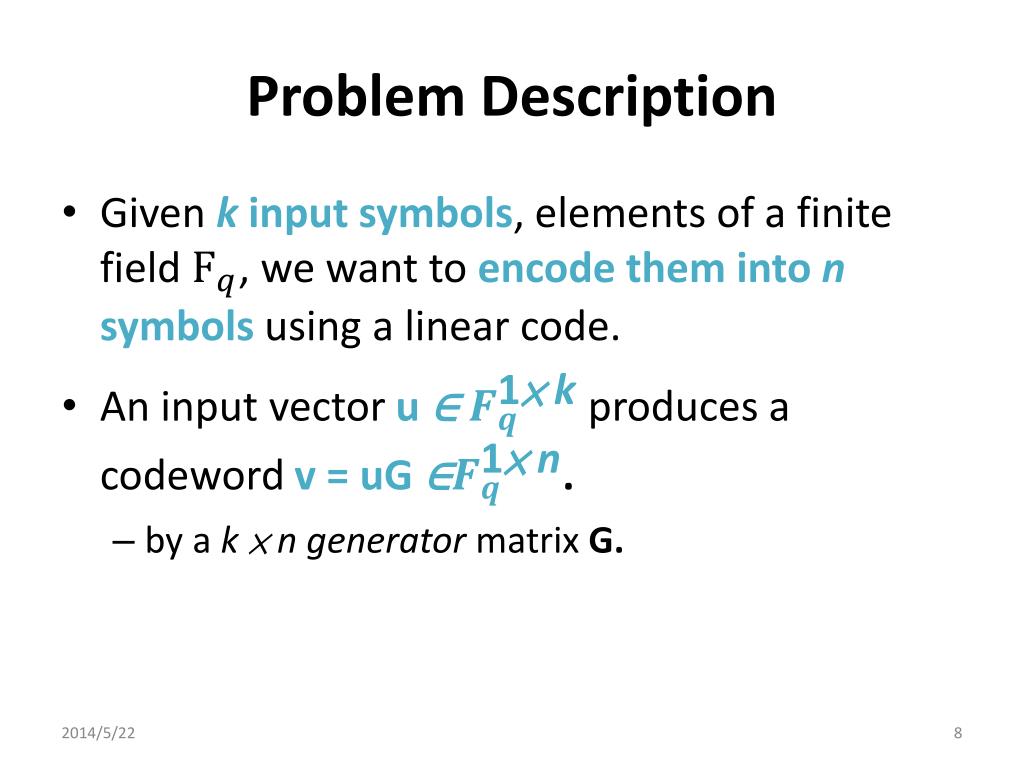 Problem Description • Given k input symbols, elements of a finite field , wewant to encode them into n symbols using a linear code. • An input vector u ∈ produces a codewordv = uG∈. • by a k × n generator matrix G.