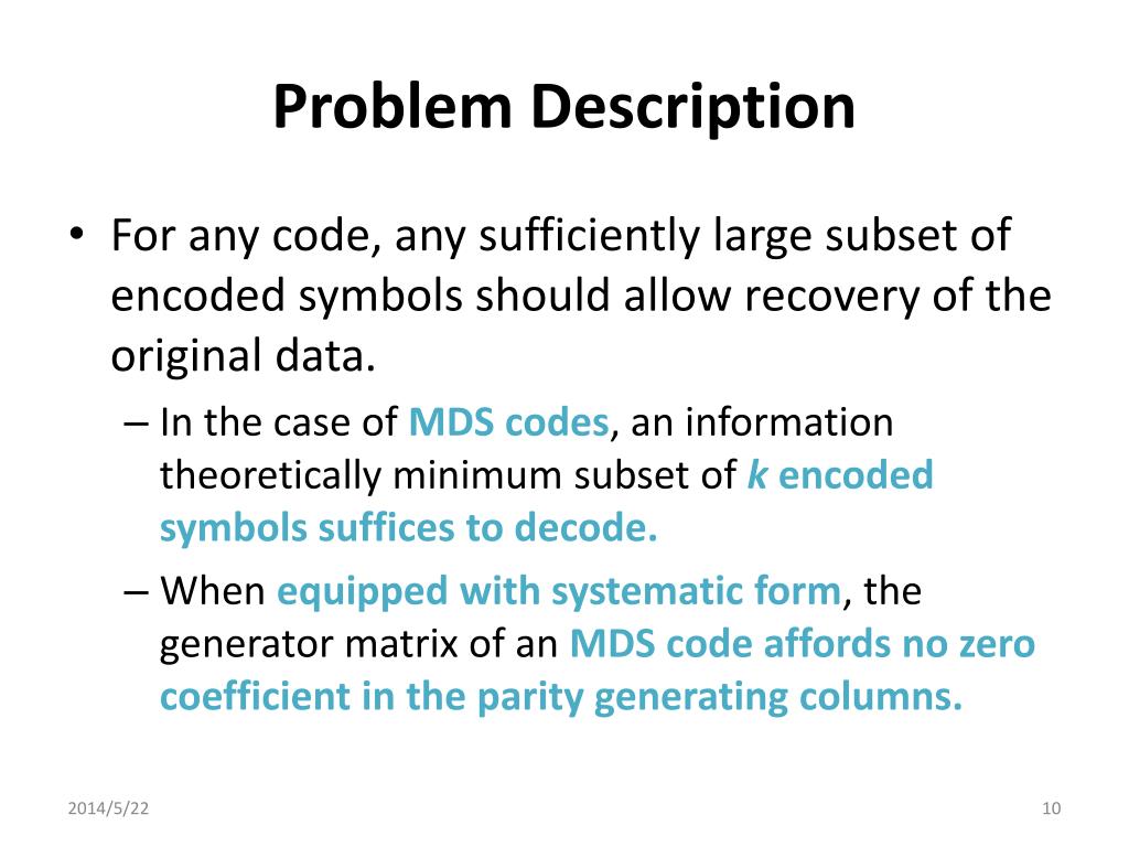 Problem Description • For any code, any sufficiently large subset of encoded symbols should allow recovery of the original data. • In the case of MDS codes, an information theoretically minimum subset of k encoded symbols suffices to decode. • When equipped with systematic form, the generator matrix of an MDS code affords no zero coefficient in the parity generating columns.
