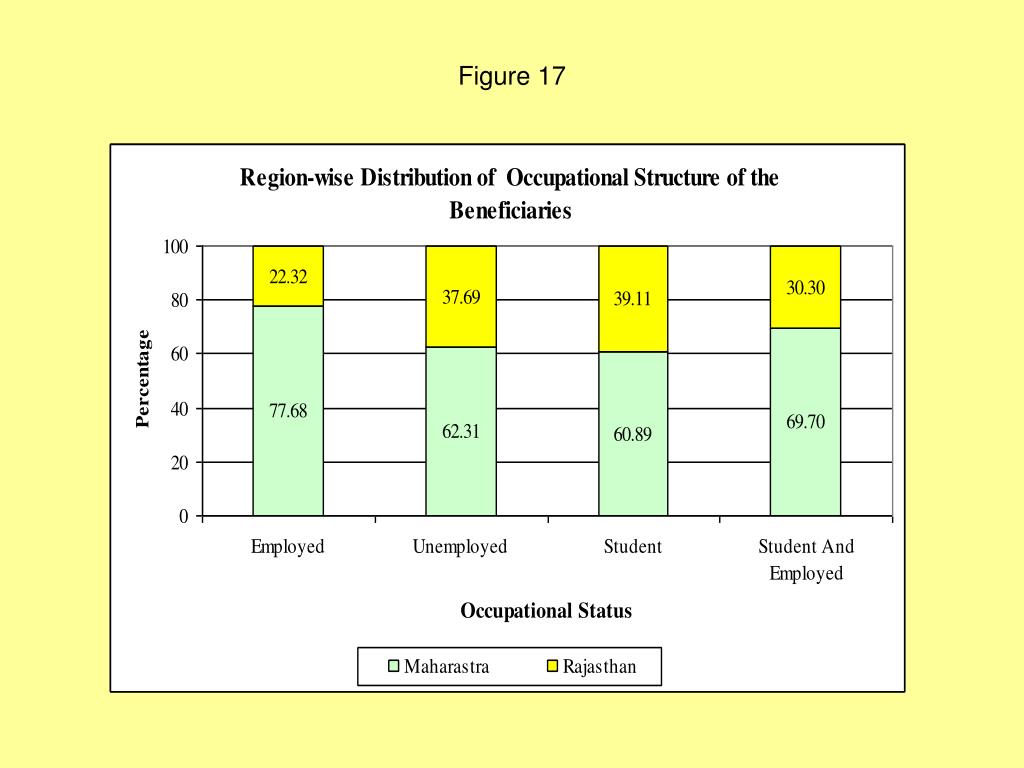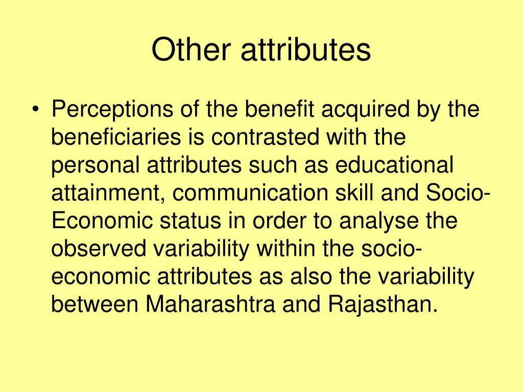 Other attributes • Perceptions of the benefit acquired by the beneficiaries is contrasted with the personal attributes such as educational attainment, communication skill and Socio-Economic status in order to analyse the observed variability within the socio-economic attributes as also the variability between Maharashtra and Rajasthan.