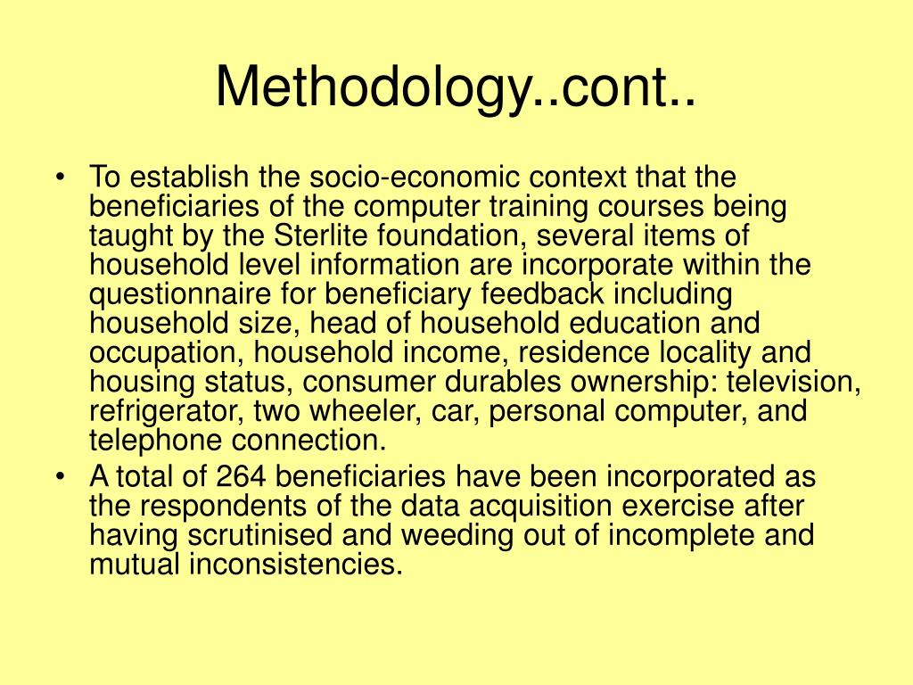Methodology..cont.. • To establish the socio-economic context that the beneficiaries of the computer training courses being taught by the Sterlite foundation, several items of household level information are incorporate within the questionnaire for beneficiary feedback including household size, head of household education and occupation, household income, residence locality and housing status, consumer durables ownership: television, refrigerator, two wheeler, car, personal computer, and telephone connection. • A total of 264 beneficiaries have been incorporated as the respondents of the data acquisition exercise after having scrutinised and weeding out of incomplete and mutual inconsistencies.