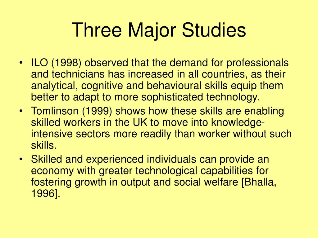 Three Major Studies • ILO (1998) observed that the demand for professionals and technicians has increased in all countries, as their analytical, cognitive and behavioural skills equip them better to adapt to more sophisticated technology. • Tomlinson (1999) shows how these skills are enabling skilled workers in the UK to move into knowledge-intensive sectors more readily than worker without such skills. • Skilled and experienced individuals can provide an economy with greater technological capabilities for fostering growth in output and social welfare [Bhalla, 1996].