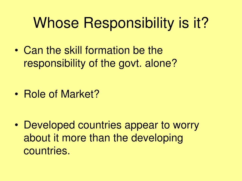 Whose Responsibility is it? • Can the skill formation be the responsibility of the govt. alone? • Role of Market? • Developed countries appear to worry about it more than the developing countries.
