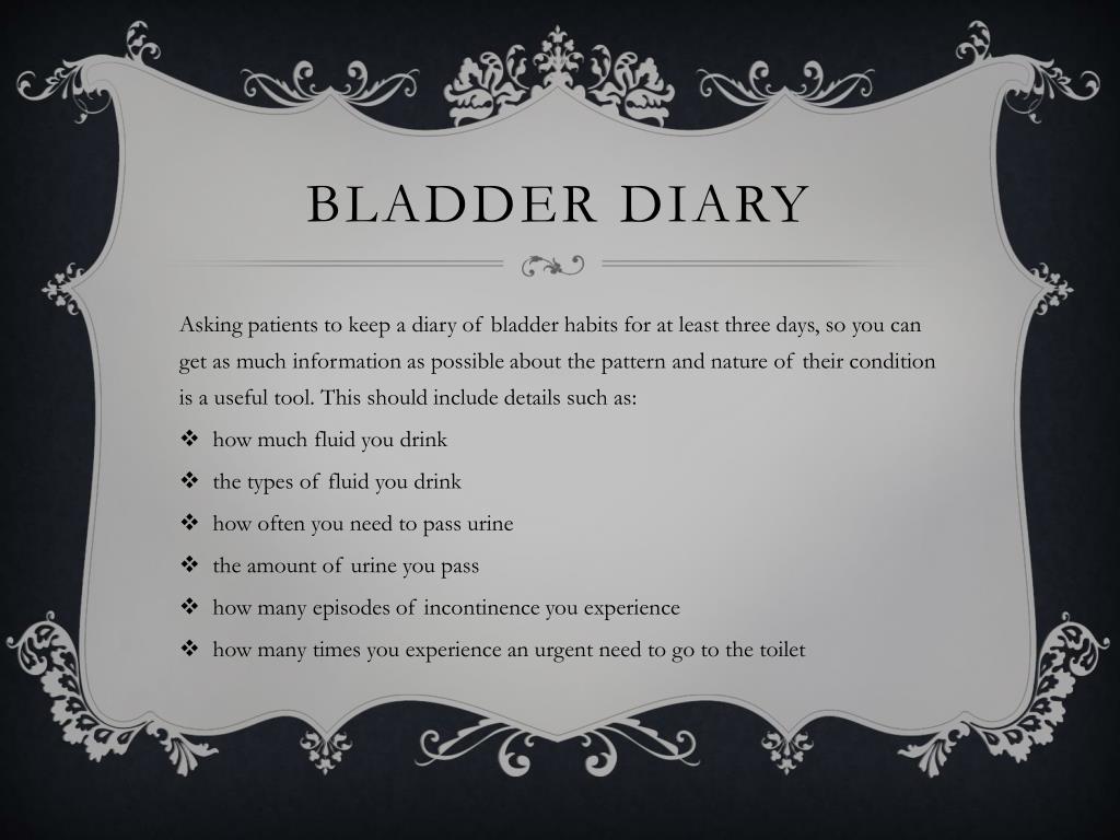 Bladder diary Asking patients to keep a diary of bladder habits for at least three days, so you can get as much information as possible about the pattern and nature of their condition is a useful tool. This should include details such as: • how much fluid you drink • the types of fluid you drink • how often you need to pass urine • the amount of urine you pass • how many episodes of incontinence you experience • how many times you experience an urgent need to go to the toilet
