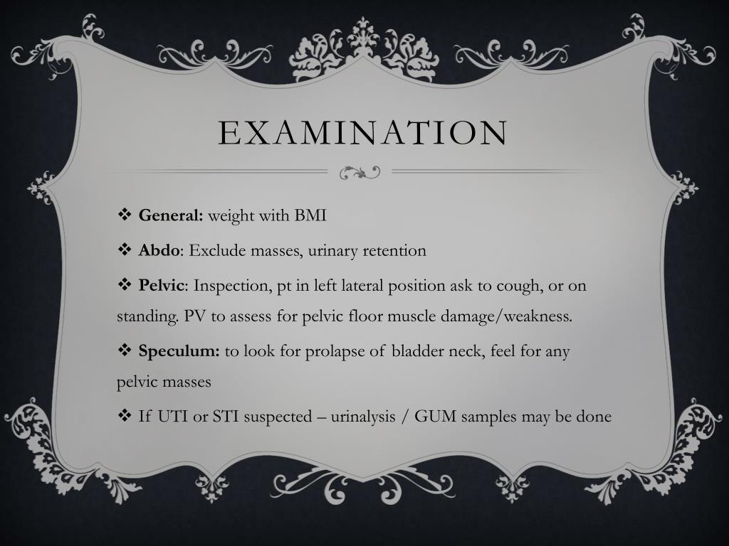 Examination • General: weight with BMI • Abdo: Exclude masses, urinary retention • Pelvic: Inspection, pt in left lateral position ask to cough, or on standing. PV to assess for pelvic floor muscle damage/weakness. • Speculum: to look for prolapse of bladder neck, feel for any pelvic masses • If UTI or STI suspected – urinalysis / GUM samples may be done
