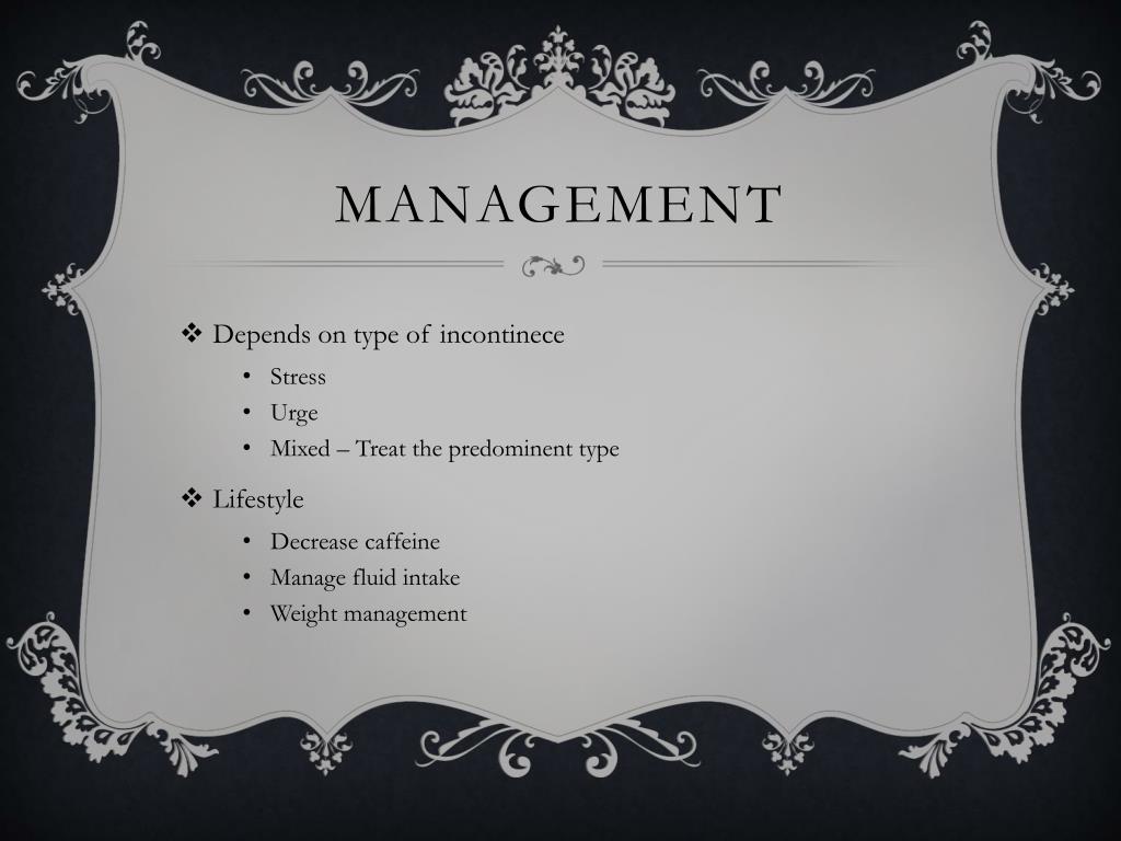 Management • Depends on type of incontinece • Stress • Urge • Mixed – Treat the predominent type • Lifestyle • Decrease caffeine • Manage fluid intake • Weight management