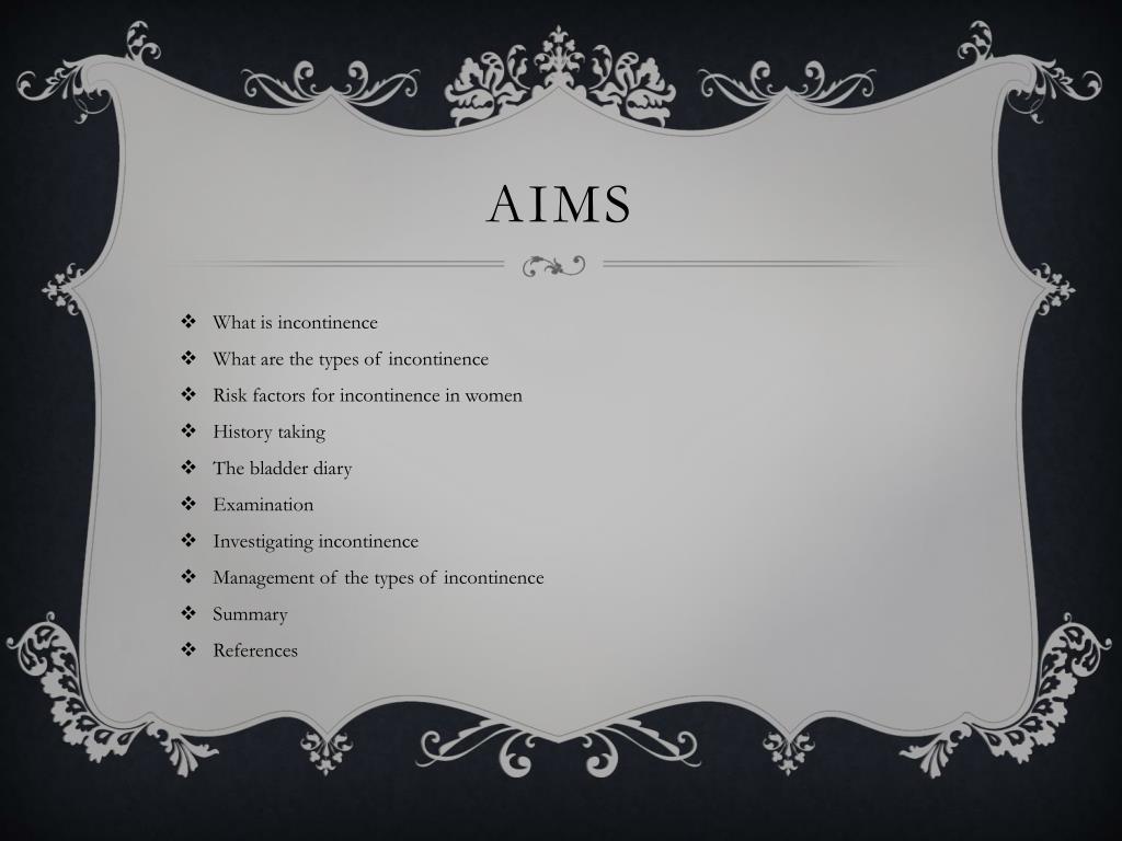 Aims • What is incontinence • What are the types of incontinence • Risk factors for incontinence in women • History taking • The bladder diary • Examination • Investigating incontinence • Management of the types of incontinence • Summary • References
