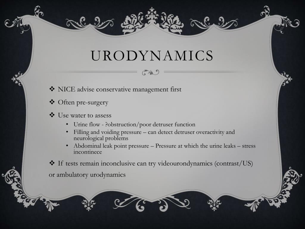 Urodynamics • NICE advise conservative management first • Often pre-surgery • Use water to assess • Urine flow - ?obstruction/poor detruser function • Filling and voiding pressure – can detect detruseroveractivity and neurological problems • Abdominal leak point pressure – Pressure at which the urine leaks – stress incontinece • If tests remain inconclusive can try videourondynamics (contrast/US) or ambulatory urodynamics
