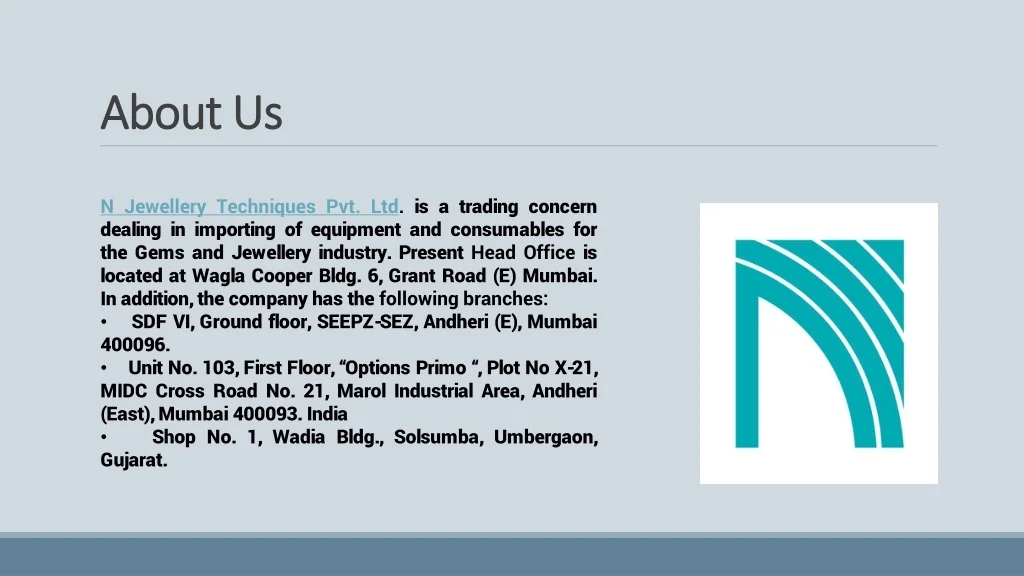 About Us • N Jewellery Techniques Pvt. Ltd. is a trading concern dealing in importing of equipment and consumables for the Gems and Jewellery industry. Present Head Office is located at Wagla Cooper Bldg. 6, Grant Road (E) Mumbai. In addition, the company has the following branches: • SDF VI, Ground floor, SEEPZ-SEZ, Andheri (E), Mumbai 400096. • Unit No. 103, First Floor, “Options Primo “, Plot No X-21, MIDC Cross Road No. 21, Marol Industrial Area, Andheri (East), Mumbai 400093. India • Shop No. 1, Wadia Bldg., Solsumba, Umbergaon, Gujarat.