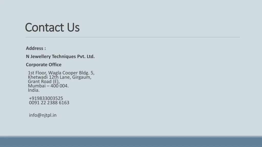 Contact Us Address : N Jewellery Techniques Pvt. Ltd. Corporate Office • 1st Floor, Wagla Cooper Bldg. 5,Khetwadi 12th Lane, Girgaum,Grant Road (E),Mumbai – 400 004.India. • +919833003525 0091 22 2388 6163 • info@njtpl.in