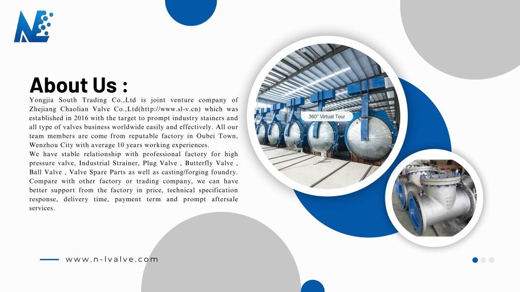 About Us : Yongjia South Trading Co.,Ltd is joint venture company of Zhejiang Chaolian Valve Co.,Ltd(http://www.sl-v.cn) which was established in 2016 with the target to prompt industry stainers and all type of valves business worldwide easily and effectively. All our team members are come from reputable factory in Oubei Town, Wenzhou City with average 10 years working experiences. We have stable relationship with professional factory for high pressure valve, Industrial Strainer, Plug Valve , Butterfly Valve , Ball Valve , Valve Spare Parts as well as casting/forging foundry. Compare with other factory or trading company, we can have better support from the factory in price, technical specification response, delivery time, payment term and prompt aftersale services. www.n-lvalve.com