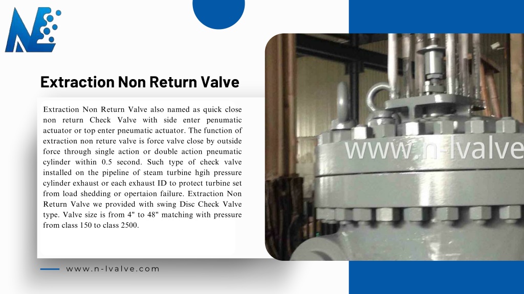 Extraction Non Return Valve Extraction Non Return Valve also named as quick close non return Check Valve with side enter penumatic actuator or top enter pneumatic actuator. The function of extraction non reture valve is force valve close by outside force through single action or double action pneumatic cylinder within 0.5 second. Such type of check valve installed on the pipeline of steam turbine hgih pressure cylinder exhaust or each exhaust ID to protect turbine set from load shedding or opertaion failure. Extraction Non Return Valve we provided with swing Disc Check Valve type. Valve size is from 4" to 48" matching with pressure from class 150 to class 2500. www.n-lvalve.com