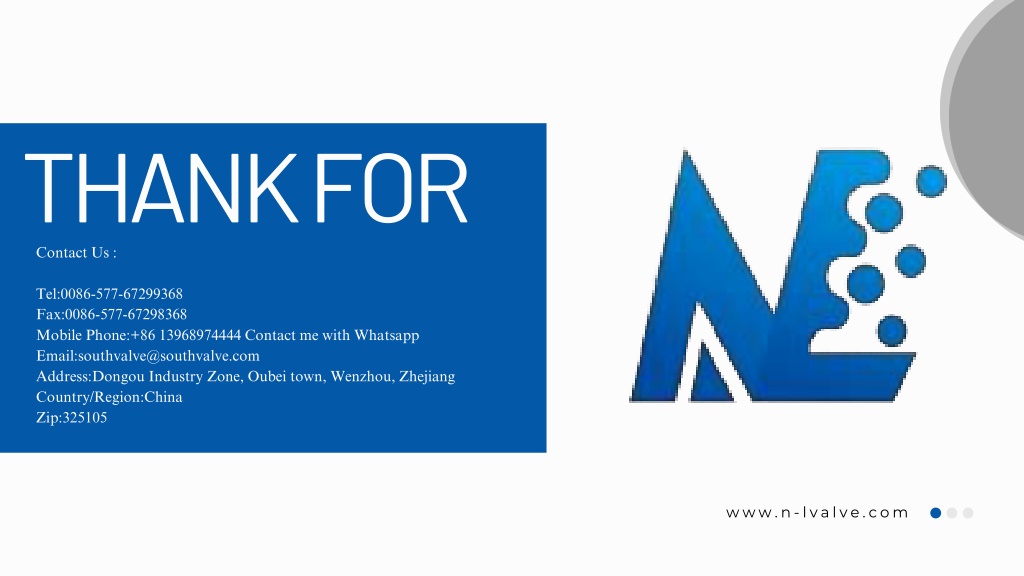 THANK FOR Contact Us : Tel:0086-577-67299368 Fax:0086-577-67298368 Mobile Phone:+86 13968974444 Contact me with Whatsapp Email:southvalve@southvalve.com Address:Dongou Industry Zone, Oubei town, Wenzhou, Zhejiang Country/Region:China Zip:325105 www.n-lvalve.com