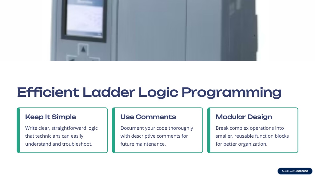 Efficient Ladder Logic Programming Keep It Simple Use Comments Modular Design Write clear, straightforward logic that technicians can easily understand and troubleshoot. Document your code thoroughly with descriptive comments for future maintenance. Break complex operations into smaller, reusable function blocks for better organization.