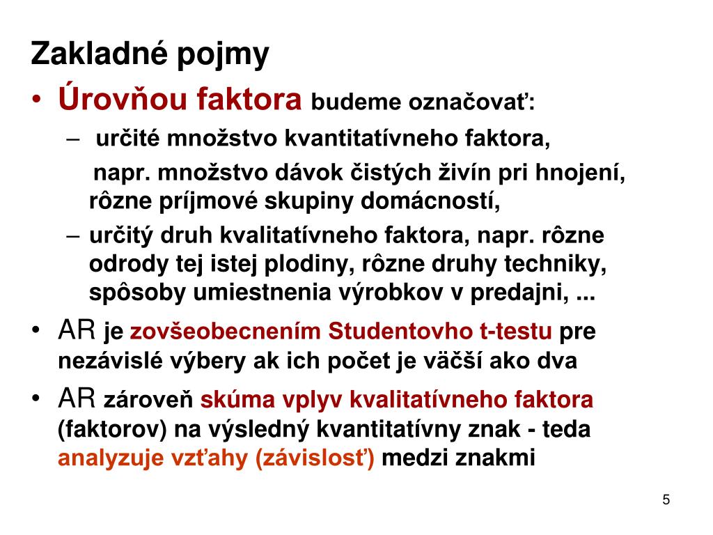 Zakladné pojmy Úrovňou faktorabudeme označovať: určité množstvo kvantitatívneho faktora, napr. množstvo dávok čistých živín pri hnojení, rôzne príjmové skupiny domácností, určitý druh kvalitatívneho faktora, napr. rôzne odrody tej istej plodiny, rôzne druhy techniky, spôsoby umiestnenia výrobkov v predajni, ... AR je zovšeobecnením Studentovho t-testu pre nezávislé výbery ak ich počet je väčší ako dva AR zároveň skúma vplyv kvalitatívneho faktora (faktorov) na výsledný kvantitatívny znak - teda analyzuje vzťahy (závislosť) medzi znakmi