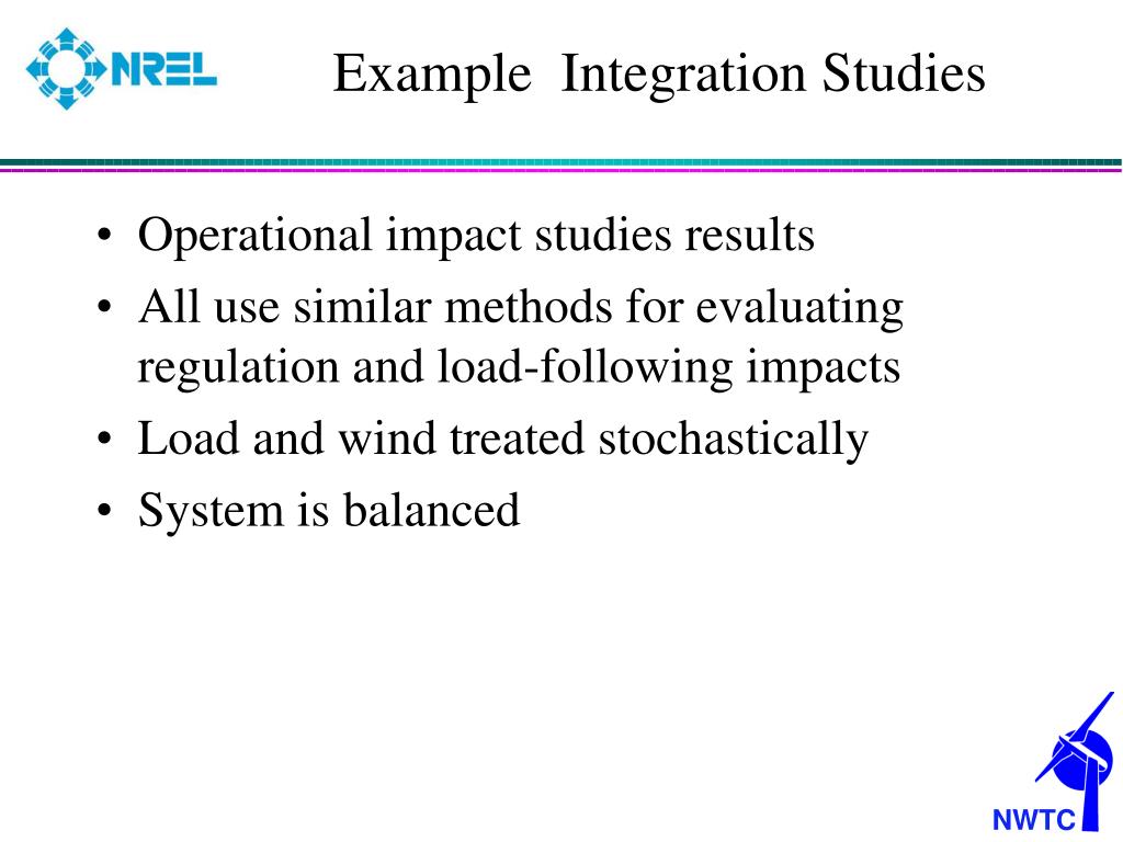 Example Integration Studies • Operational impact studies results • All use similar methods for evaluating regulation and load-following impacts • Load and wind treated stochastically • System is balanced