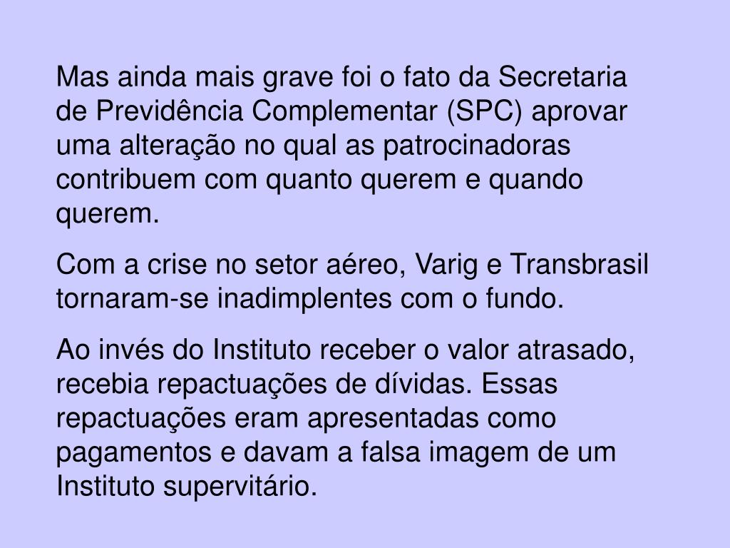 Mas ainda mais grave foi o fato da Secretaria de Previdência Complementar (SPC) aprovar uma alteração no qual as patrocinadoras contribuem com quanto querem e quando querem. Com a crise no setor aéreo, Varig e Transbrasil tornaram-se inadimplentes com o fundo. Ao invés do Instituto receber o valor atrasado, recebia repactuações de dívidas. Essas repactuações eram apresentadas como pagamentos e davam a falsa imagem de um Instituto supervitário.