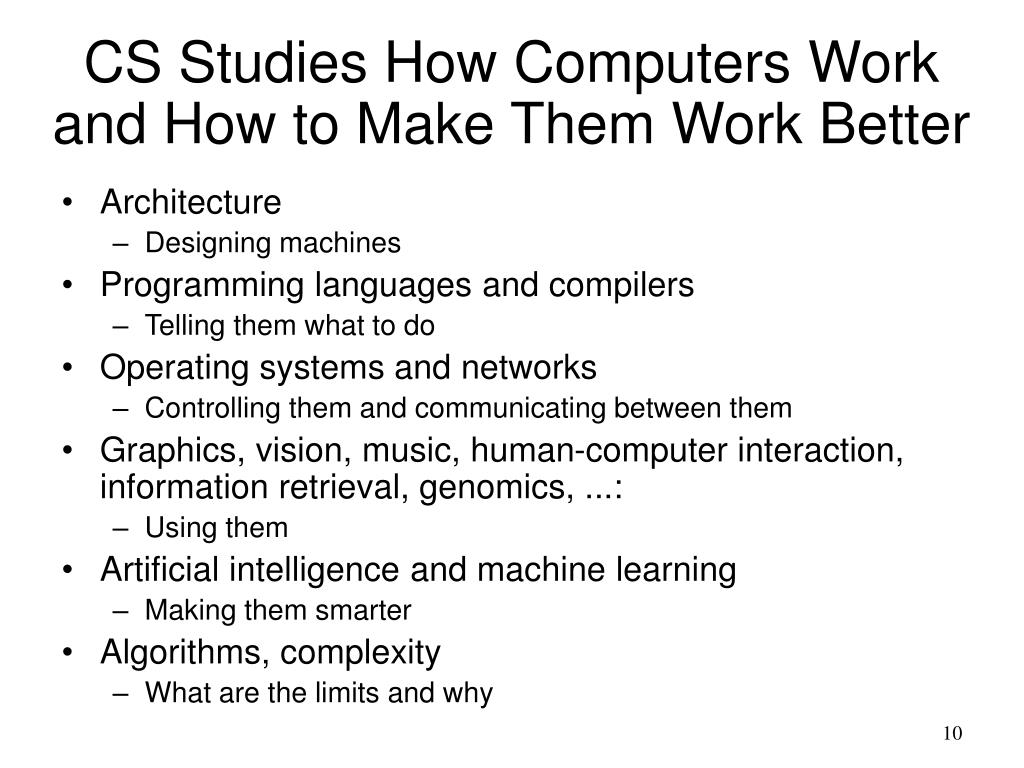 CS Studies How Computers Work and How to Make Them Work Better • Architecture • Designing machines • Programming languages and compilers • Telling them what to do • Operating systems and networks • Controlling them and communicating between them • Graphics, vision, music, human-computer interaction, information retrieval, genomics, ...: • Using them • Artificial intelligence and machine learning • Making them smarter • Algorithms, complexity • What are the limits and why