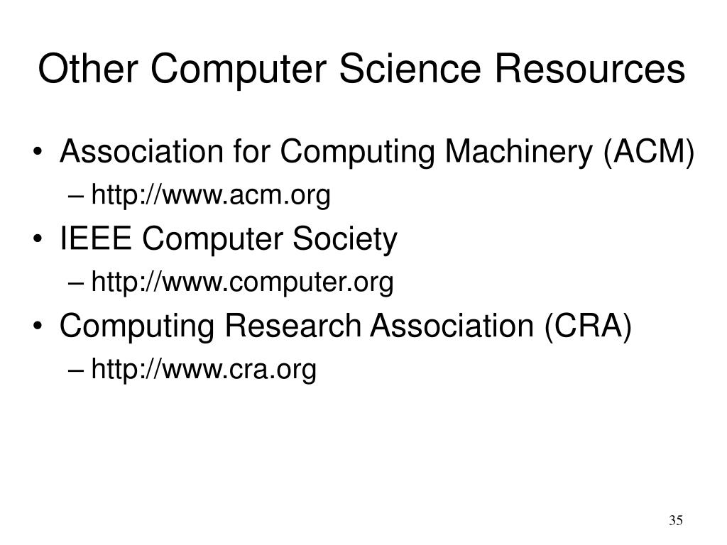Other Computer Science Resources • Association for Computing Machinery (ACM) • http://www.acm.org • IEEE Computer Society • http://www.computer.org • Computing Research Association (CRA) • http://www.cra.org