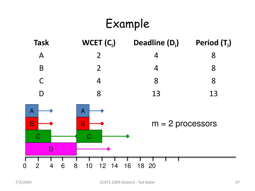 Example: Global EDF • m identical processors • global = • jobs can run on any processor • can be preempted, and migrated • EDF = “earliest deadline first” • earlier deadline implies higher priority • the top m jobs will execute • no processor is idle unless there are fewer than m jobs ready to run