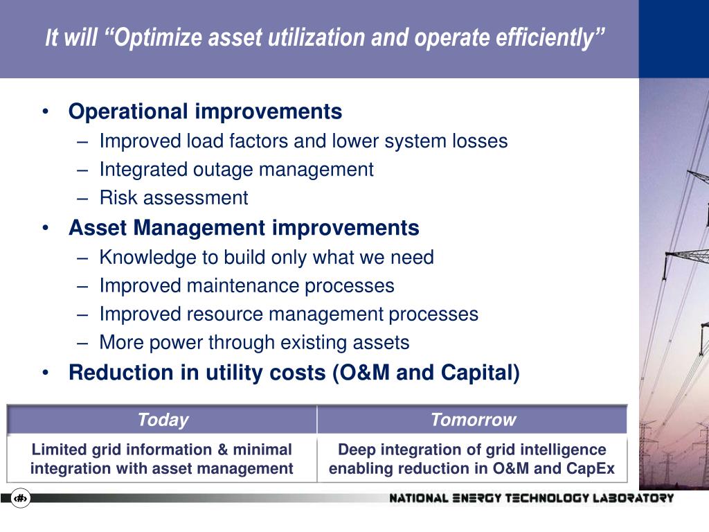 It will “Optimize asset utilization and operate efficiently” 21 • Operational improvements • Improved load factors and lower system losses • Integrated outage management • Risk assessment • Asset Management improvements • Knowledge to build only what we need • Improved maintenance processes • Improved resource management processes • More power through existing assets • Reduction in utility costs (O&M and Capital)