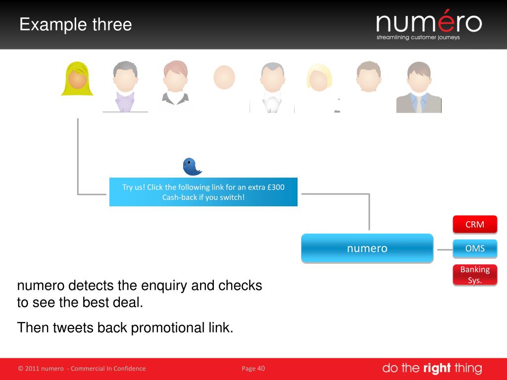 Example three numero detects the enquiry and checks to see the best deal. Then tweets back promotional link. Try us! Click the following link for an extra £300 Cash-back if you switch! CRM numero OMS Banking Sys.
