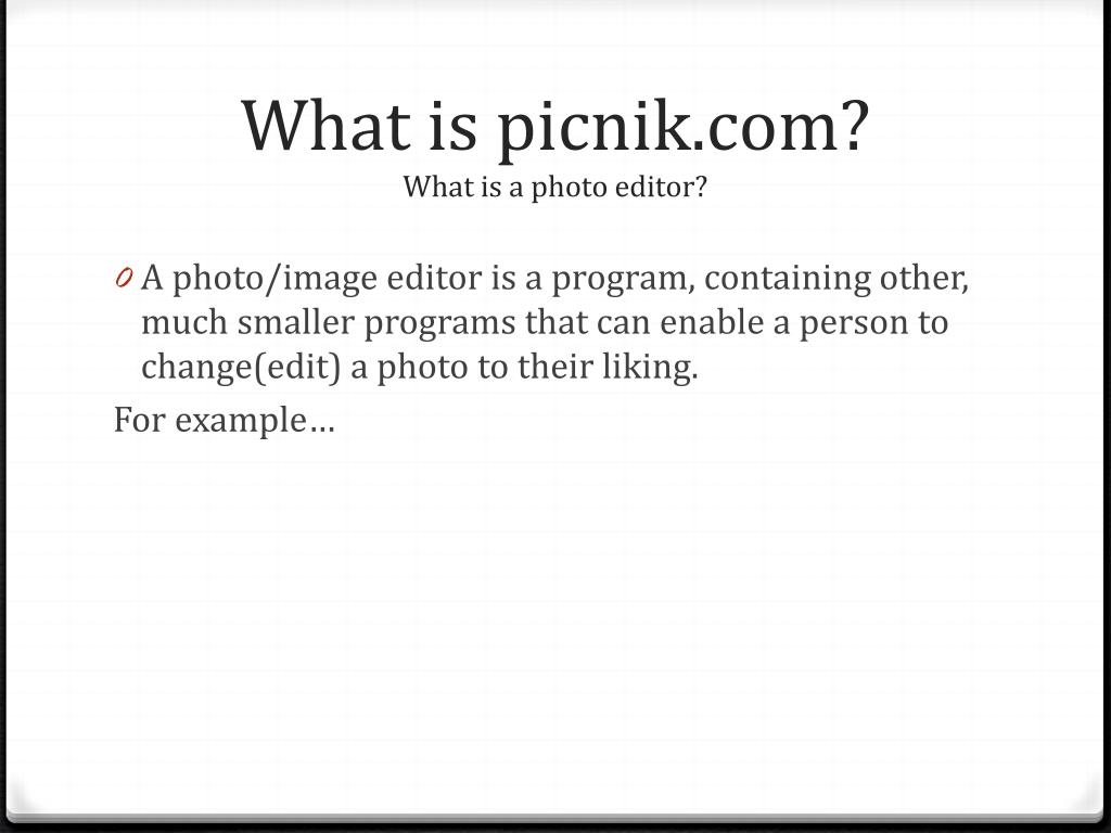 What is picnik.com? What is a photo editor? • A photo/image editor is a program, containing other, much smaller programs that can enable a person to change(edit) a photo to their liking. For example…
