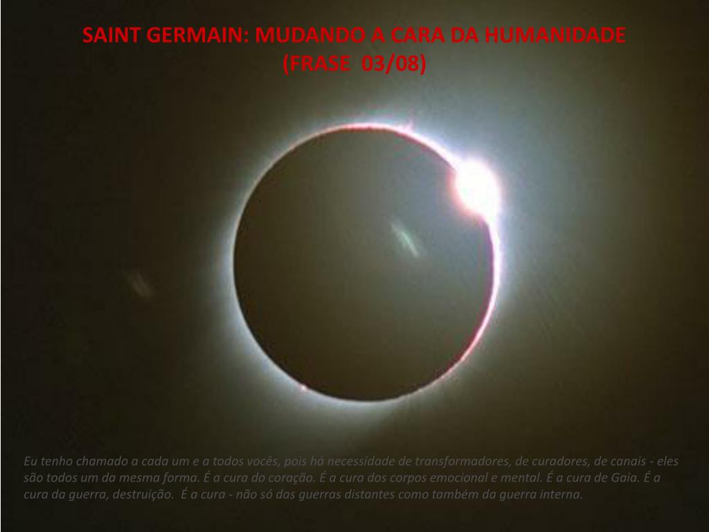 SAINT GERMAIN: MUDANDO A CARA DA HUMANIDADE (FRASE 03/08) Eu tenho chamado a cada um e a todos vocês, pois há necessidade de transformadores, de curadores, de canais - eles são todos um da mesma forma. É a cura do coração. É a cura dos corpos emocional e mental. É a cura de Gaia. É a cura da guerra, destruição. É a cura - não só das guerras distantes como também da guerra interna.