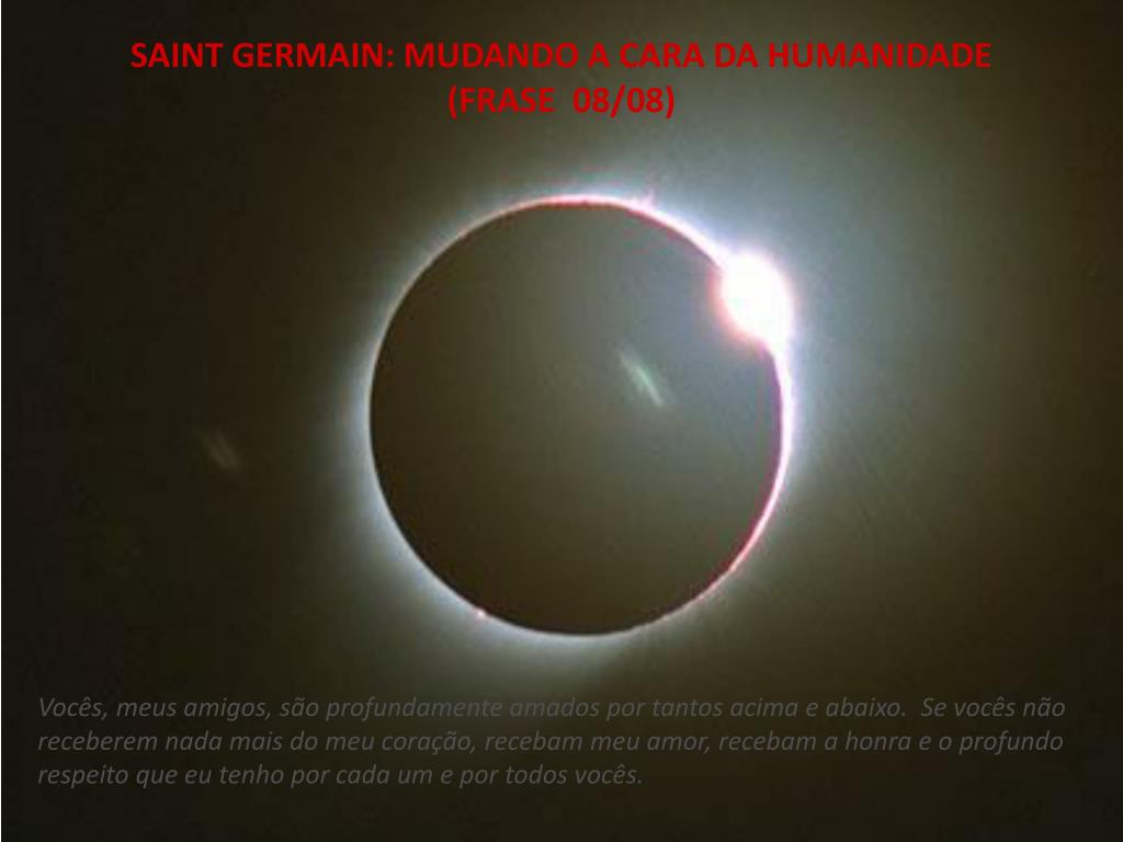 SAINT GERMAIN: MUDANDO A CARA DA HUMANIDADE (FRASE 08/08) Vocês, meus amigos, são profundamente amados por tantos acima e abaixo. Se vocês não receberem nada mais do meu coração, recebam meu amor, recebam a honra e o profundo respeito que eu tenho por cada um e por todos vocês.