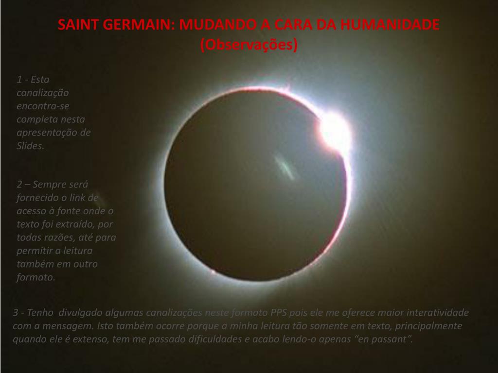 SAINT GERMAIN: MUDANDO A CARA DA HUMANIDADE (Observações) 1 - Esta canalização encontra-se completa nesta apresentação de Slides. 2 – Sempre será fornecido o link de acesso à fonte onde o texto foi extraído, por todas razões, até para permitir a leitura também em outro formato. 3 - Tenho divulgado algumas canalizações neste formato PPS pois ele me oferece maior interatividade com a mensagem. Isto também ocorre porque a minha leitura tão somente em texto, principalmente quando ele é extenso, tem me passado dificuldades e acabo lendo-o apenas “en passant”.