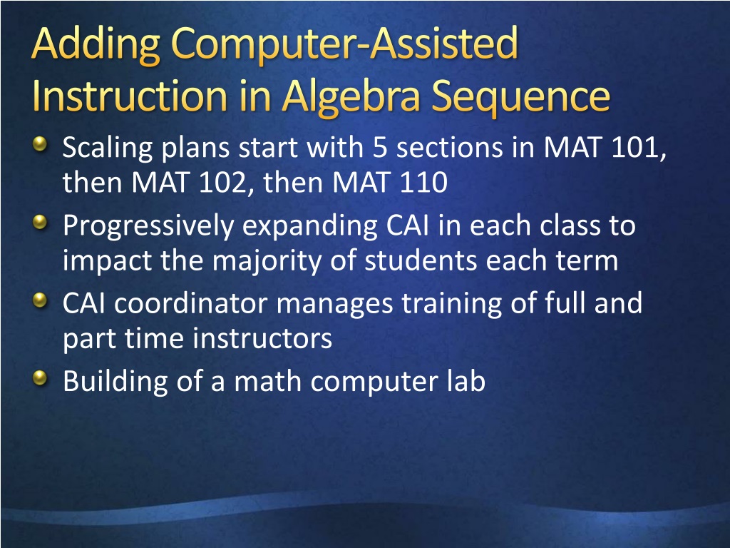 Adding Computer-Assisted Instruction in Algebra Sequence • Scaling plans start with 5 sections in MAT 101, then MAT 102, then MAT 110 • Progressively expanding CAI in each class to impact the majority of students each term • CAI coordinator manages training of full and part time instructors • Building of a math computer lab
