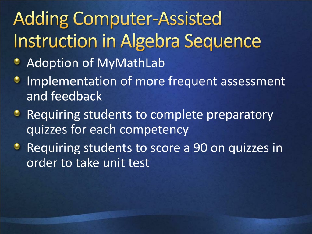Adding Computer-Assisted Instruction in Algebra Sequence • Adoption of MyMathLab • Implementation of more frequent assessment and feedback • Requiring students to complete preparatory quizzes for each competency • Requiring students to score a 90 on quizzes in order to take unit test