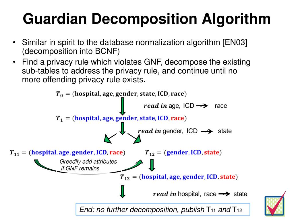 Guardian Decomposition Algorithm • Similar in spirit to the database normalization algorithm [EN03] (decomposition into BCNF) • Find a privacy rule which violates GNF, decompose the existing sub-tables to address the privacy rule, and continue until no more offending privacy rule exists. Greedily add attributes if GNF remains End: no further decomposition, publish T11 and T12
