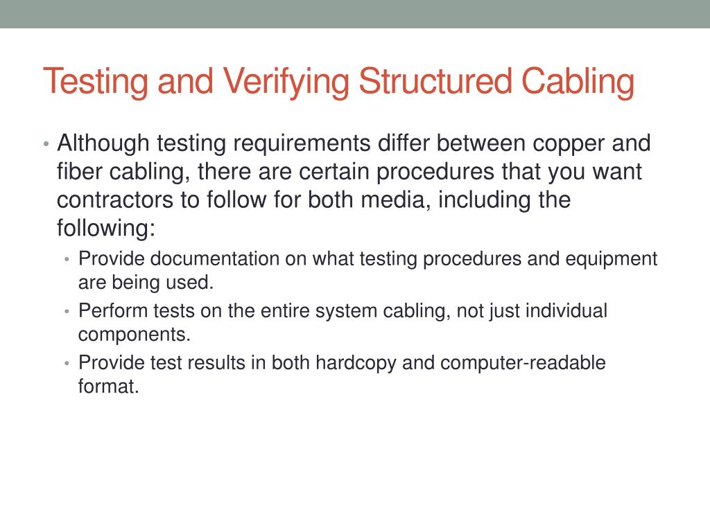 Testing and Verifying Structured Cabling • Although testing requirements differ between copper and fiber cabling, there are certain procedures that you want contractors to follow for both media, including the following: • Provide documentation on what testing procedures and equipment are being used. • Perform tests on the entire system cabling, not just individual components. • Provide test results in both hardcopy and computer-readable format.