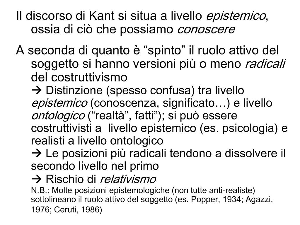 Il discorso di Kant si situa a livello epistemico, ossia di ciò che possiamo conoscere A seconda di quanto è “spinto” il ruolo attivo del soggetto si hanno versioni più o meno radicali del costruttivismo Distinzione (spesso confusa) tra livello epistemico (conoscenza, significato…) e livello ontologico (“realtà”, fatti”); si può essere costruttivisti a livello epistemico (es. psicologia) e realisti a livello ontologico Le posizioni più radicali tendono a dissolvere il secondo livello nel primo Rischio di relativismoN.B.: Molte posizioni epistemologiche (non tutte anti-realiste) sottolineano il ruolo attivo del soggetto (es. Popper, 1934; Agazzi, 1976; Ceruti, 1986)