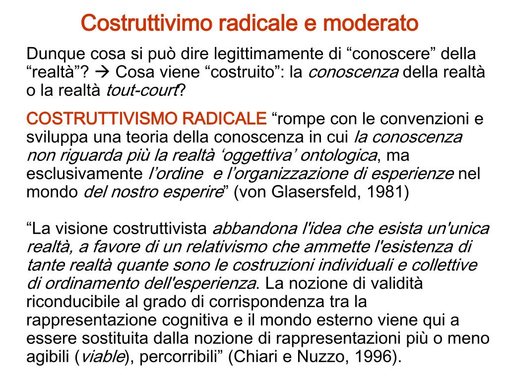 Costruttivimo radicale e moderato Dunque cosa si può dire legittimamente di “conoscere” della “realtà”? Cosa viene “costruito”: la conoscenza della realtà o la realtà tout-court? COSTRUTTIVISMO RADICALE “rompe con le convenzioni e sviluppa una teoria della conoscenza in cui la conoscenza non riguarda più la realtà ‘oggettiva’ ontologica, ma esclusivamente l’ordine e l’organizzazione di esperienze nel mondo del nostro esperire” (von Glasersfeld, 1981) “La visione costruttivista abbandona l'idea che esista un'unica realtà, a favore di un relativismo che ammette l'esistenza di tante realtà quante sono le costruzioni individuali e collettive di ordinamento dell'esperienza. La nozione di validità riconducibile al grado di corrispondenza tra la rappresentazione cognitiva e il mondo esterno viene qui a essere sostituita dalla nozione di rappresentazioni più o meno agibili (viable), percorribili” (Chiari e Nuzzo, 1996).