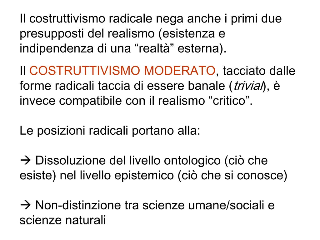 Il costruttivismo radicale nega anche i primi due presupposti del realismo (esistenza e indipendenza di una “realtà” esterna). Il COSTRUTTIVISMO MODERATO, tacciato dalle forme radicali taccia di essere banale (trivial), è invece compatibile con il realismo “critico”. Le posizioni radicali portano alla: Dissoluzione del livello ontologico (ciò che esiste) nel livello epistemico (ciò che si conosce) Non-distinzione tra scienze umane/sociali e scienze naturali