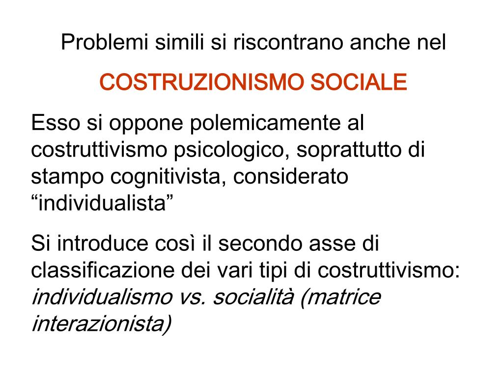 Problemi simili si riscontrano anche nel COSTRUZIONISMO SOCIALE Esso si oppone polemicamente al costruttivismo psicologico, soprattutto di stampo cognitivista, considerato “individualista” Si introduce così il secondo asse di classificazione dei vari tipi di costruttivismo:individualismo vs. socialità (matrice interazionista)