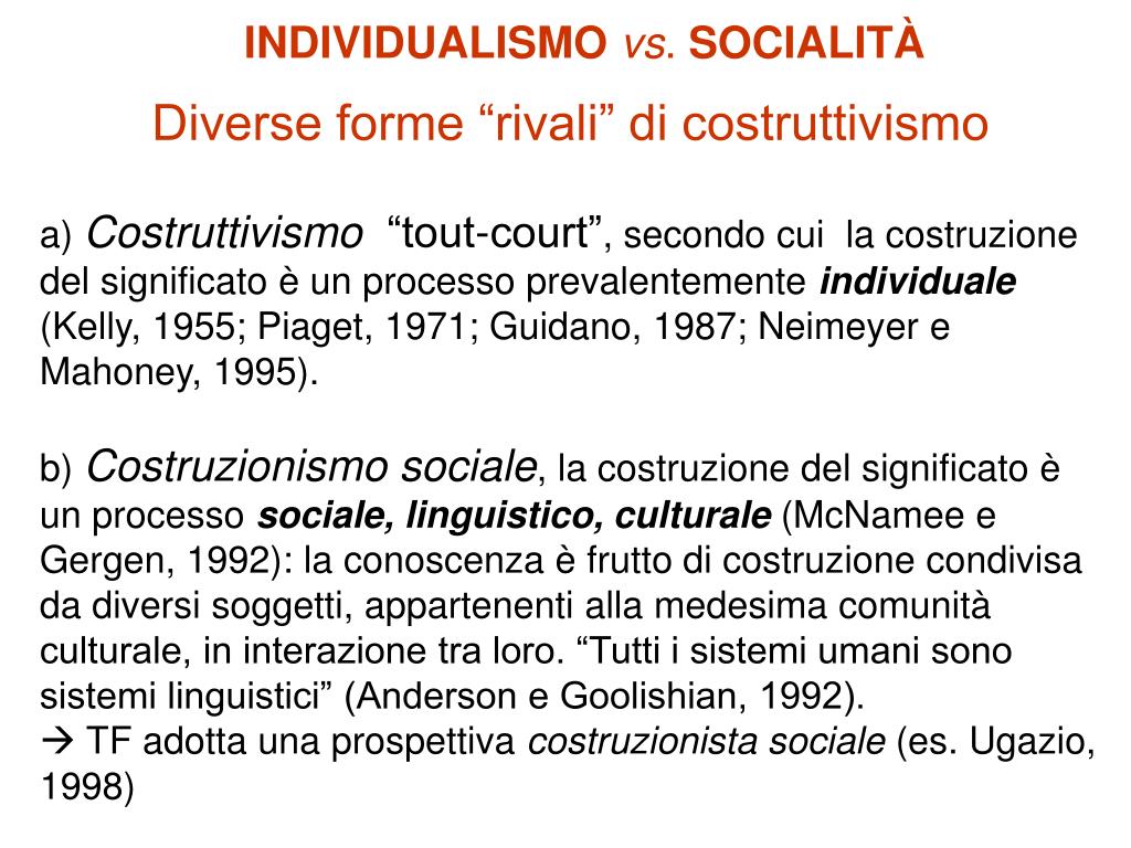 INDIVIDUALISMOvs. SOCIALITÀ Diverse forme “rivali” di costruttivismo a) Costruttivismo “tout-court”, secondo cui la costruzione del significato è un processo prevalentemente individuale (Kelly, 1955; Piaget, 1971; Guidano, 1987; Neimeyer e Mahoney, 1995). b) Costruzionismo sociale, la costruzione del significato è un processo sociale, linguistico, culturale (McNamee e Gergen, 1992): la conoscenza è frutto di costruzione condivisa da diversi soggetti, appartenenti alla medesima comunità culturale, in interazione tra loro. “Tutti i sistemi umani sono sistemi linguistici” (Anderson e Goolishian, 1992). TF adotta una prospettiva costruzionista sociale (es. Ugazio, 1998)