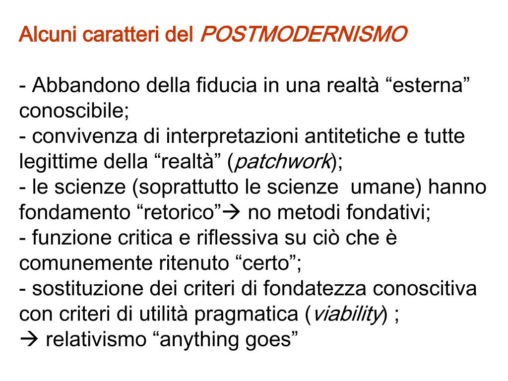 Alcuni caratteri del POSTMODERNISMO- Abbandono della fiducia in una realtà “esterna” conoscibile;- convivenza di interpretazioni antitetiche e tutte legittime della “realtà” (patchwork); - le scienze (soprattutto le scienze umane) hanno fondamento “retorico” no metodi fondativi;- funzione critica e riflessiva su ciò che è comunemente ritenuto “certo”; - sostituzione dei criteri di fondatezza conoscitiva con criteri di utilità pragmatica (viability) ; relativismo “anything goes”