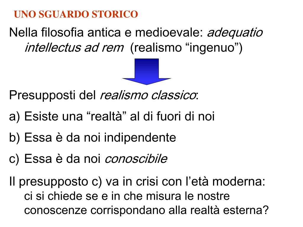 UNO SGUARDO STORICO Nella filosofia antica e medioevale: adequatio intellectus ad rem (realismo “ingenuo”) • Presupposti del realismo classico: • Esiste una “realtà” al di fuori di noi • Essa è da noi indipendente • Essa è da noi conoscibile • Il presupposto c) va in crisi con l’età moderna:ci si chiede se e in che misura le nostre conoscenze corrispondano alla realtà esterna?