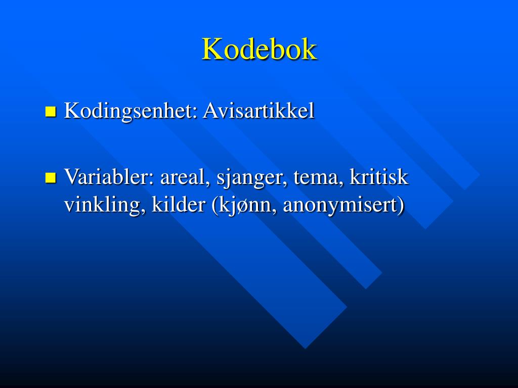 Kodebok • Kodingsenhet: Avisartikkel • Variabler: areal, sjanger, tema, kritisk vinkling, kilder (kjønn, anonymisert)
