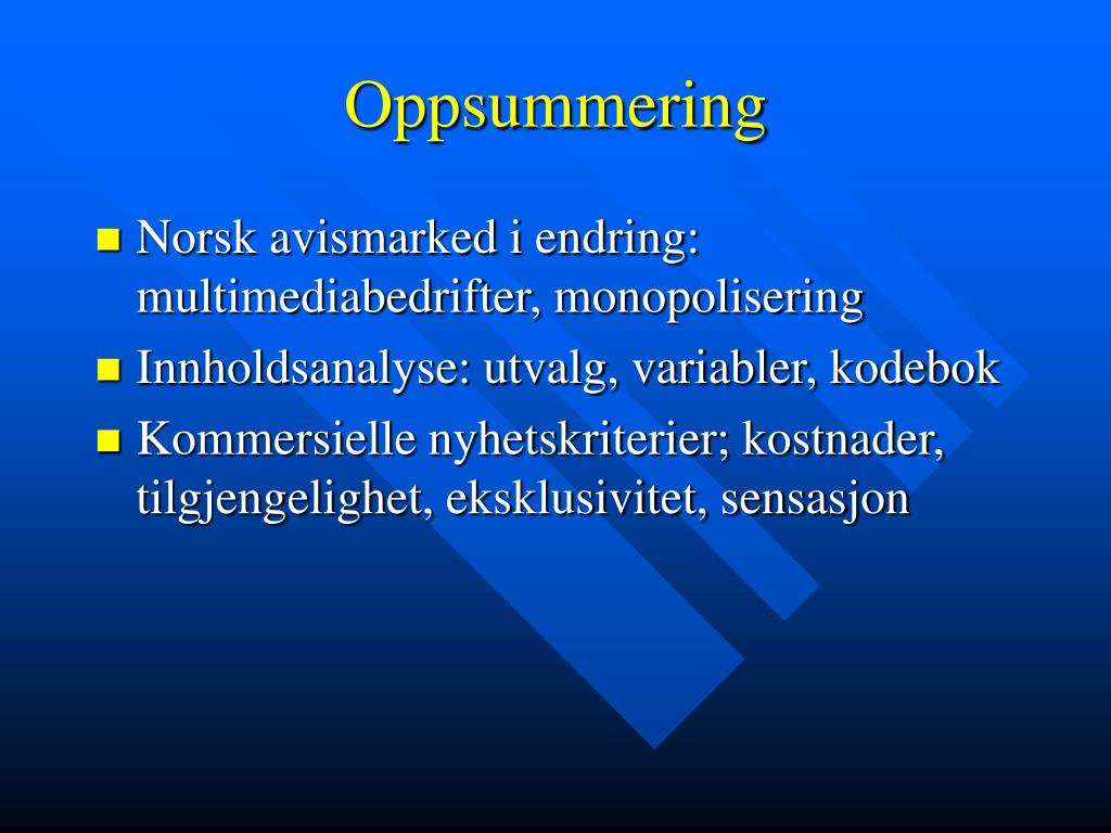 Oppsummering • Norsk avismarked i endring: multimediabedrifter, monopolisering • Innholdsanalyse: utvalg, variabler, kodebok • Kommersielle nyhetskriterier; kostnader, tilgjengelighet, eksklusivitet, sensasjon