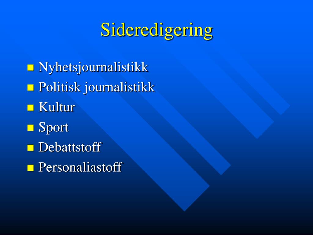 Sideredigering • Nyhetsjournalistikk • Politisk journalistikk • Kultur • Sport • Debattstoff • Personaliastoff