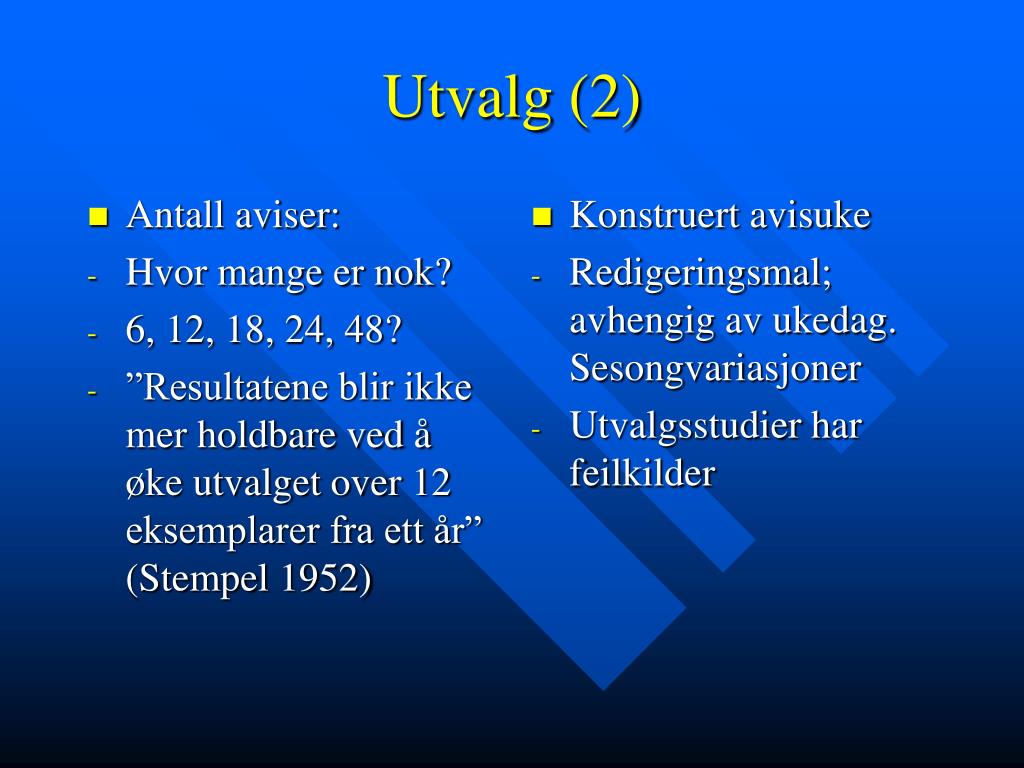 Antall aviser: Hvor mange er nok? 6, 12, 18, 24, 48? ”Resultatene blir ikke mer holdbare ved å øke utvalget over 12 eksemplarer fra ett år” (Stempel 1952) Konstruert avisuke Redigeringsmal; avhengig av ukedag. Sesongvariasjoner Utvalgsstudier har feilkilder Utvalg (2)
