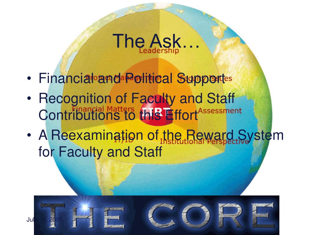 The Ask… • Financial and Political Support • Recognition of Faculty and Staff Contributions to this Effort • A Reexamination of the Reward System for Faculty and Staff