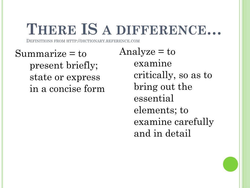 There IS a difference…Definitions from http://dictionary.reference.com Summarize = to present briefly; state or express in a concise form Analyze = to examine critically, so as to bring out the essential elements; to examine carefully and in detail