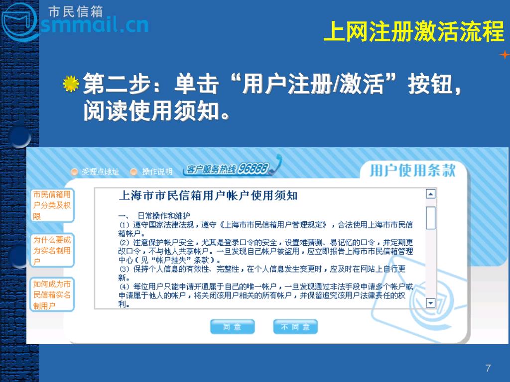 上网注册激活流程 • 第五步:设置用户名和口令等 已经是市民信箱实名用户,则可省略这步