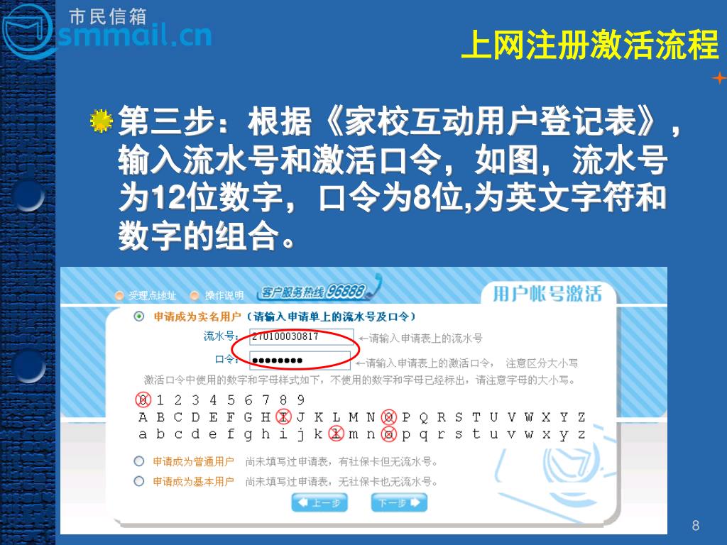 上网注册激活流程 • 第三步:根据《家校互动用户登记表》,输入流水号和激活口令,如图,流水号为12位数字,口令为8位,为英文字符和数字的组合。