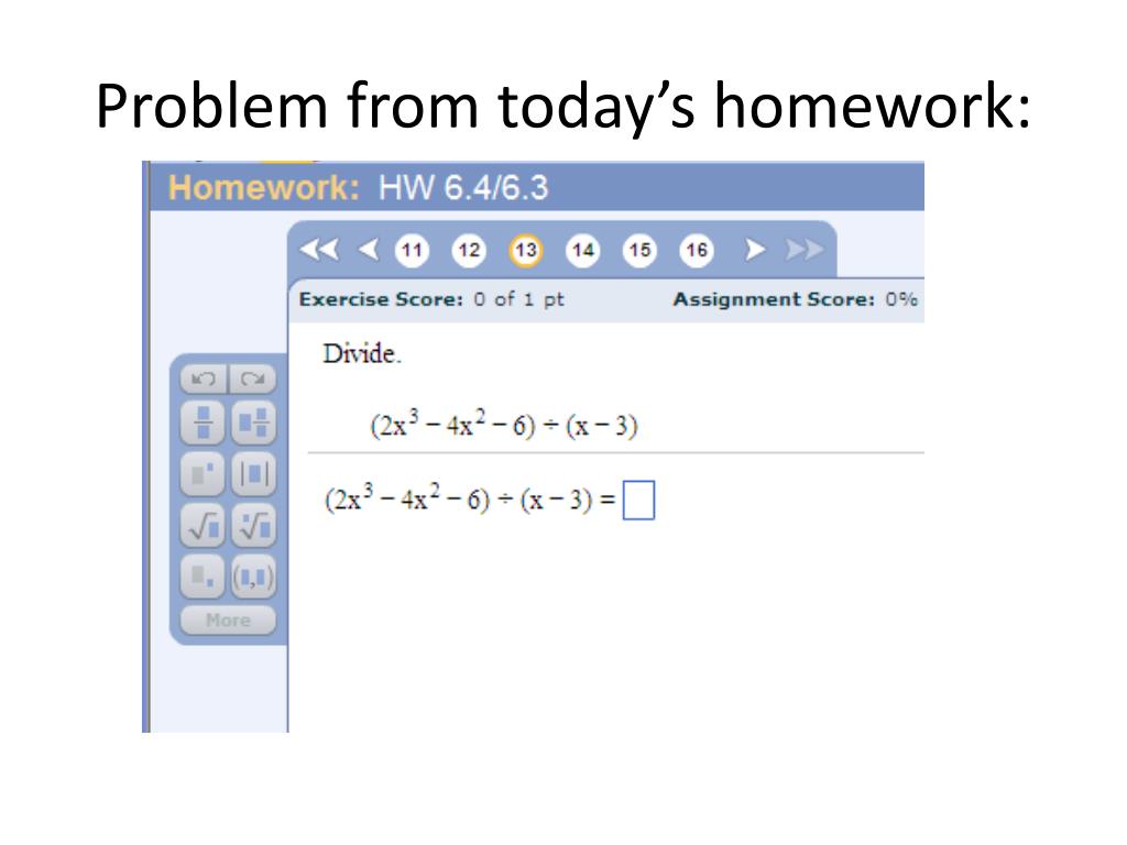 Something to be aware of on Problem #14 in today’s homework: The online “Help Me Solve This” instructions for this problem demonstrate a method called “Synthetic Division”. (We are not covering this method in class, because it is only useful in the cases where the divisor is of the form x – c.) You will get the same answer using the long division method, so this is what we expect you to use to solve this problem. (If you are already familiar with synthetic division, you’re welcome to use it in those cases where it is applicable, but we aren’t expecting you to learn it on your own.)