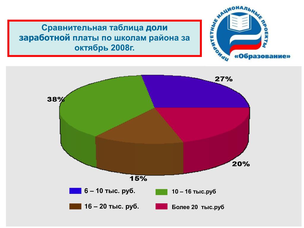 Сравнительная таблица доли заработной платы по школам района за октябрь 2008г. 6 – 10 тыс. руб. 10 – 16 тыс.руб 16 – 20 тыс. руб. Более 20 тыс.руб